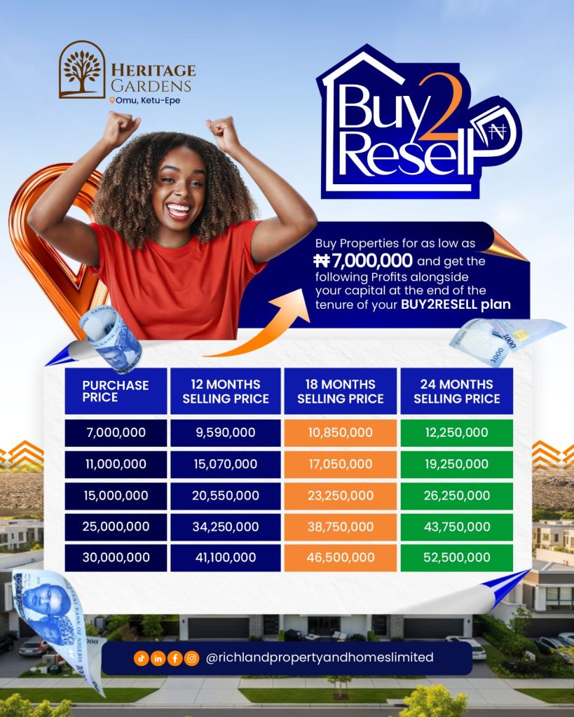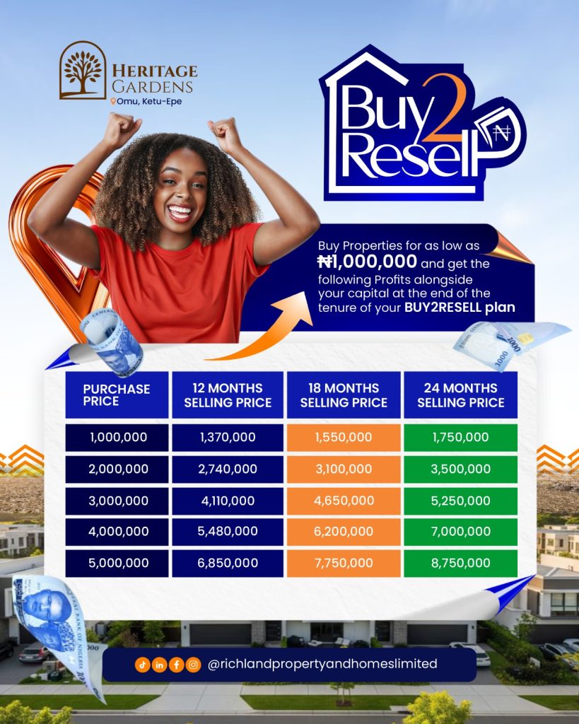 Buy properties for as low as N66,000,000 and get profits alongside your capital at the end of the tenure of your BUY2RESELL plan.
